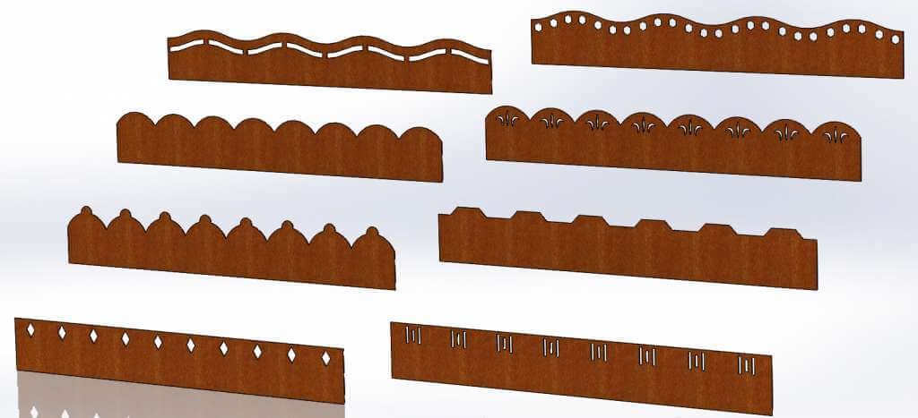Niille, jotka etsivät omaperäisiä, eksklusiivisia ja koristeellisia maisemointiratkaisuja, tarjoamme Corten-teräksisiä reunakiviä, joissa on tyylikkäitä koristeita reunakiven näkyvässä osassa. Tämä valinta sopii täydellisesti niille, jotka haluavat luoda uniikin ja leikkisän maiseman. Tarjolla on kahdeksan erilaista reunatyyppiä, jotka voidaan sovittaa helposti erilaisiin arkkitehtonisiin rakenteisiin, piha- tai puutarhaelementteihin sekä tilan yleiseen tyyliin.