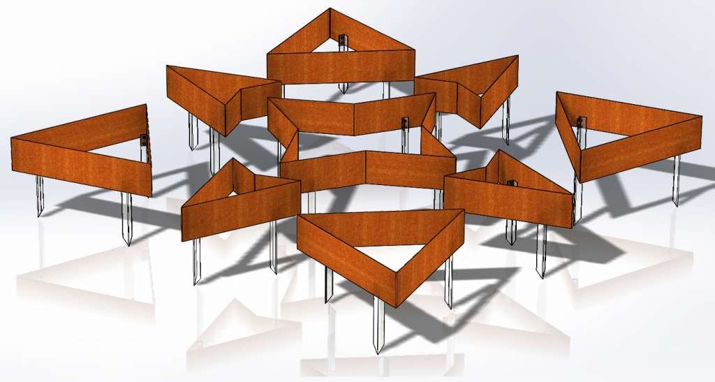 Poikkeuksellisen kaunis rakennelma, joka koostuu erillisistä, täysin hitsatuista osista. Kaikki osat asetetaan ja kiinnitetään maahan metallinastoilla (nastat työnnetään maahan ja kiinnitetään ruuveilla Corten-osaan). Reunusten vakiokorkeus on 200 mm, ja valmistamme myös muun korkuisia reunakiviä yksitellen. Asennettaessa rakennetta haluttuun paikkaan voit valita osien väliset etäisyydet yksitellen. Suosittelemme symmetrian säilyttämistä. On myös mahdollista ostaa yksittäisiä osia tästä rakennetta (jos haluat laajentaa rakennetta tai sinulla ei ole tarpeeksi tilaa). Mitä maaperää käyttää ja mitä kasveja istuttaa, on oma valintasi (voit keksiä lisää ideoita).
