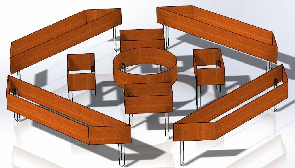 Poikkeuksellisen kaunis rakenne, joka koostuu erillisistä, täysin hitsatuista osista. Kaikki osat asetetaan ja kiinnitetään maahan metallinastoilla (nastat työnnetään maahan ja kiinnitetään ruuveilla Corten-osaan). Reunusten vakiokorkeus on 200 mm, valmistamme myös muun korkuisia reunakiviä yksitellen. Asennettaessa rakennetta haluttuun paikkaan voit valita osien väliset etäisyydet yksitellen. Suosittelemme symmetrian säilyttämistä. On myös mahdollista ostaa yksittäisiä osia tästä rakenteesta (jos haluat laajentaa rakennetta tai sinulla ei ole tarpeeksi tilaa). Mitä maaperää käyttää ja mitä kasveja istuttaa, on oma valintasi (voit keksiä lisää ideoita).