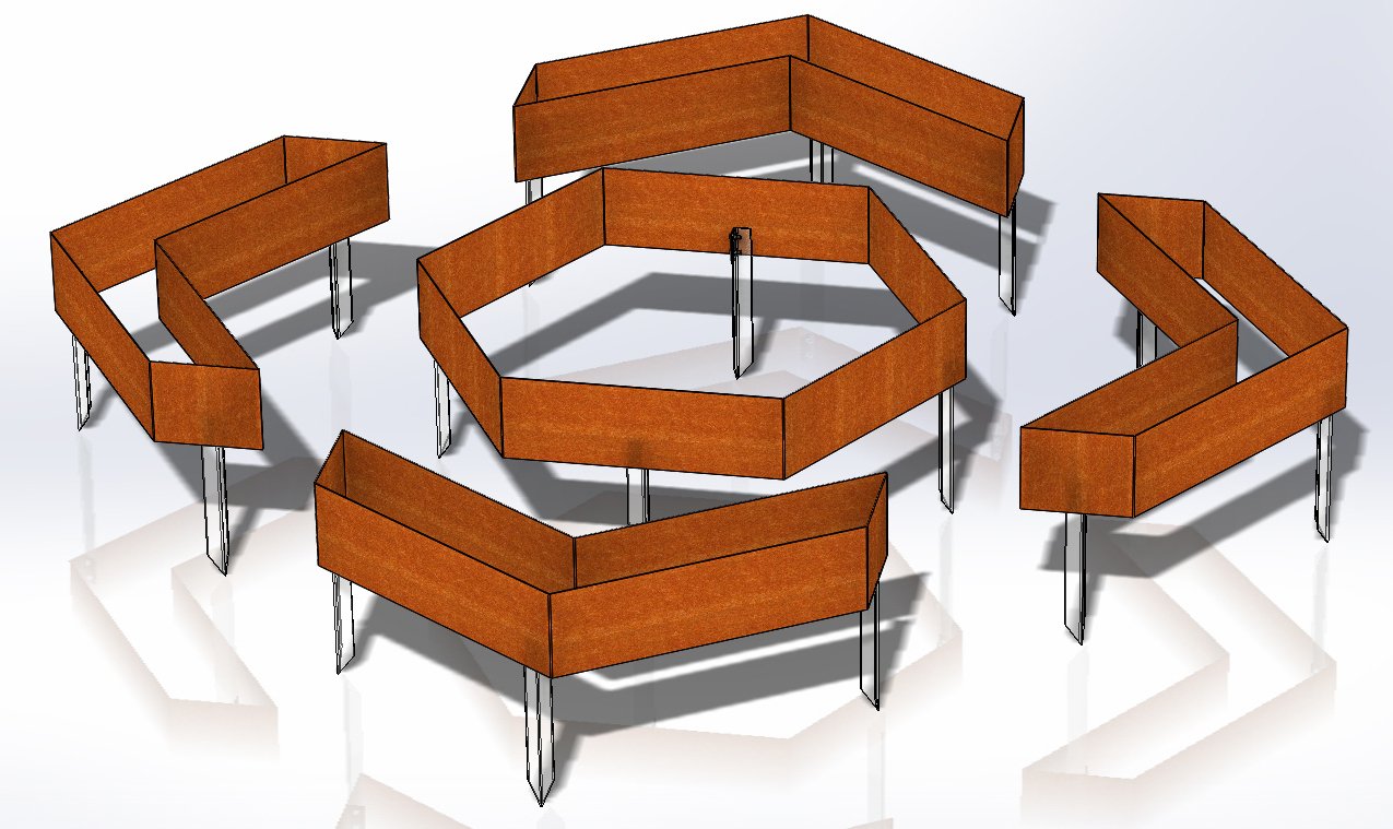 Poikkeuksellisen kaunis rakenne, joka koostuu erillisistä, täysin hitsatuista osista. Kaikki osat asetetaan ja kiinnitetään maahan metallinastoilla (nastat työnnetään maahan ja kiinnitetään ruuveilla Corten-osaan). Reunusten vakiokorkeus on 200 mm, ja valmistamme myös muun korkuisia reunakiviä yksitellen. Asennettaessa rakennetta haluttuun paikkaan voit valita osien väliset etäisyydet yksitellen. Suosittelemme symmetrian säilyttämistä. On myös mahdollista ostaa yksittäisiä osia tästä rakenteesta (jos haluat laajentaa rakennetta tai sinulla ei ole tarpeeksi tilaa). Mitä maaperää käyttää ja mitä kasveja istuttaa, on oma valintasi (voit keksiä lisää ideoita).