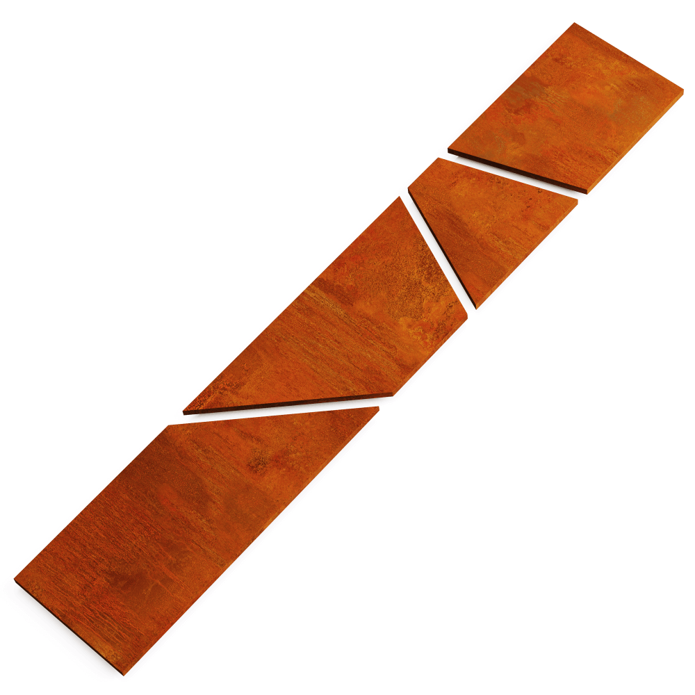 Laatat on valmistettu 4 mm paksusta Corten-teräksestä, ja niissä on 30 mm korkea taite, joka antaa niille tilavuutta. Sisäpuolen reunojen jäykkyys takaa rakenteen luotettavuuden ja vakauden, mikä varmistaa niiden pitkän käyttöiän. Corten-teräksen ainutlaatuinen väri ja rakenne säilyttävät laattojen edustavuuden jopa vuosien käytön jälkeen.
